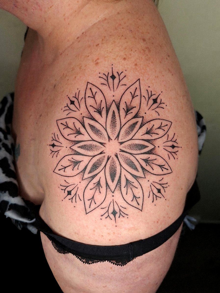 Ce tatouage est une fusion harmonieuse entre la géométrie sacrée et l'art floral. Placé de manière anatomique sur l'arrondi de l'épaule, il se distingue par :La Technique du Dotwork : Les dégradés à l'intérieur des pétales centraux sont réalisés par une accumulation de points, offrant une profondeur subtile et une texture douce qui contraste avec les lignes nettes.Le Design Floral : La structure en "fleur de vie" se déploie en plusieurs couches, partant d'un cœur lumineux vers des feuilles nervurées, évoquant la croissance et l'équilibre.Les Détails Ornementaux : Les fines lignes extérieures se terminant par de petits losanges ajoutent une touche de légèreté et un aspect "bijou" à l'ensemble de la pièce.C'est une œuvre à la fois intemporelle et délicate, parfaitement adaptée aux courbes du corps pour un rendu fluide et esthétique.