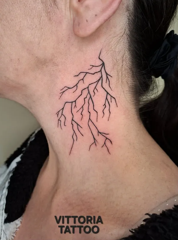 Tatouage coup de foudre minimaliste en fine line sur le cou, motif éclair organique et discret, réalisé chez Vittoria Tattoo, studio de tatouage situé au 38 rue Vieille à Aubusson