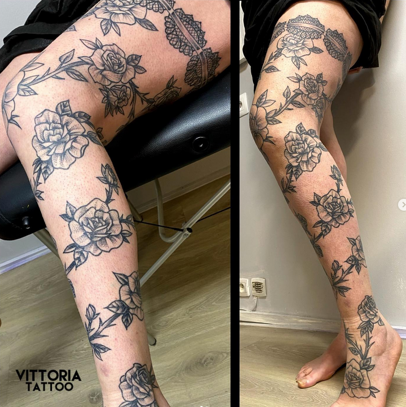 Tatouage floral noir et gris avec composition de roses et feuillage sur toute la jambe, réalisé chez Vittoria Tattoo, 38 rue Vieille, 23200 Aubusson.